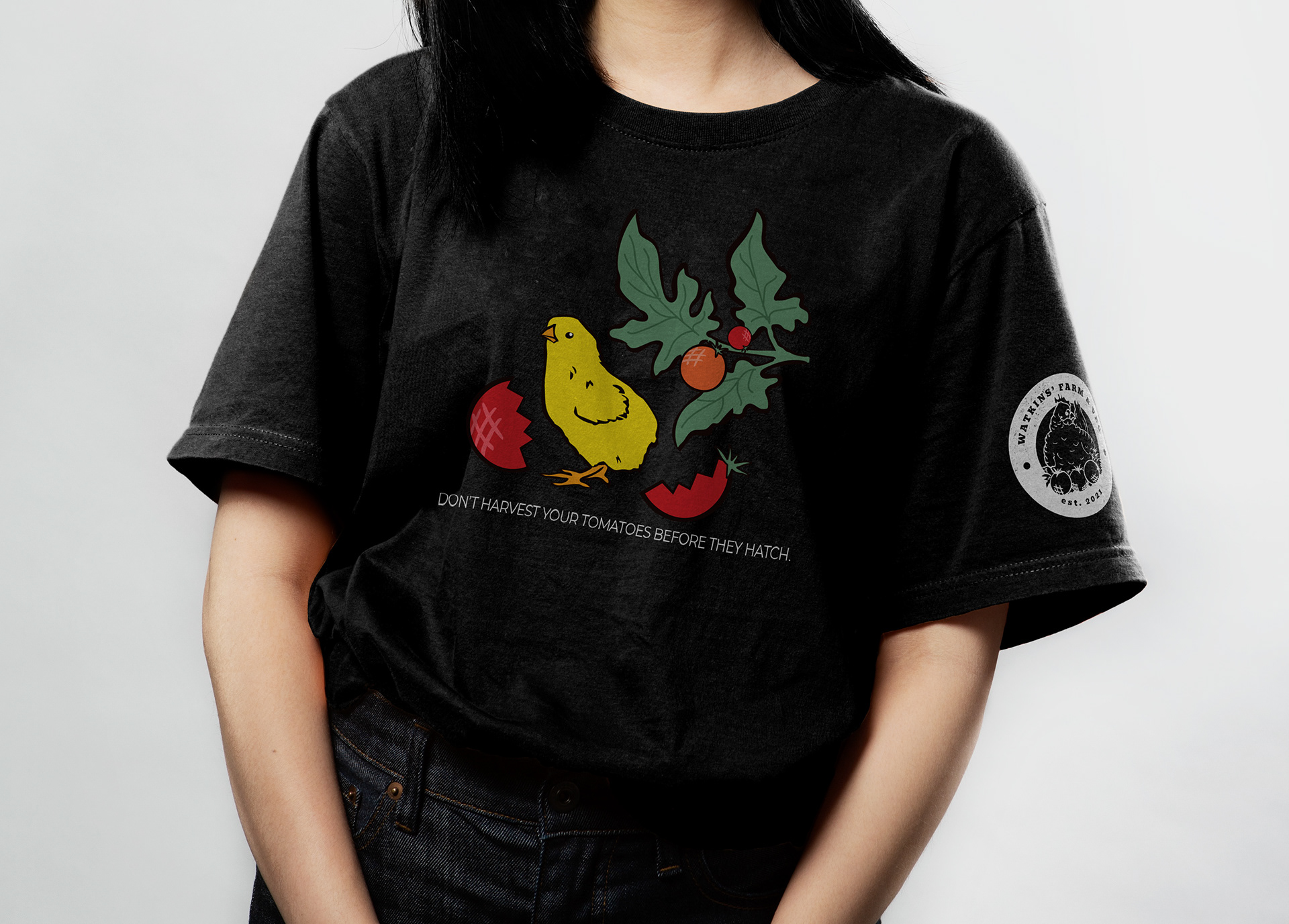 This fun "Don't harvest your tomatoes before they hatch" design brings a light-hearted look at the brand and their products. Sustainability is important to the Watkins', so printing their designs and brand on pre-loved shirts is one of the many ideas they have brewing for the market.