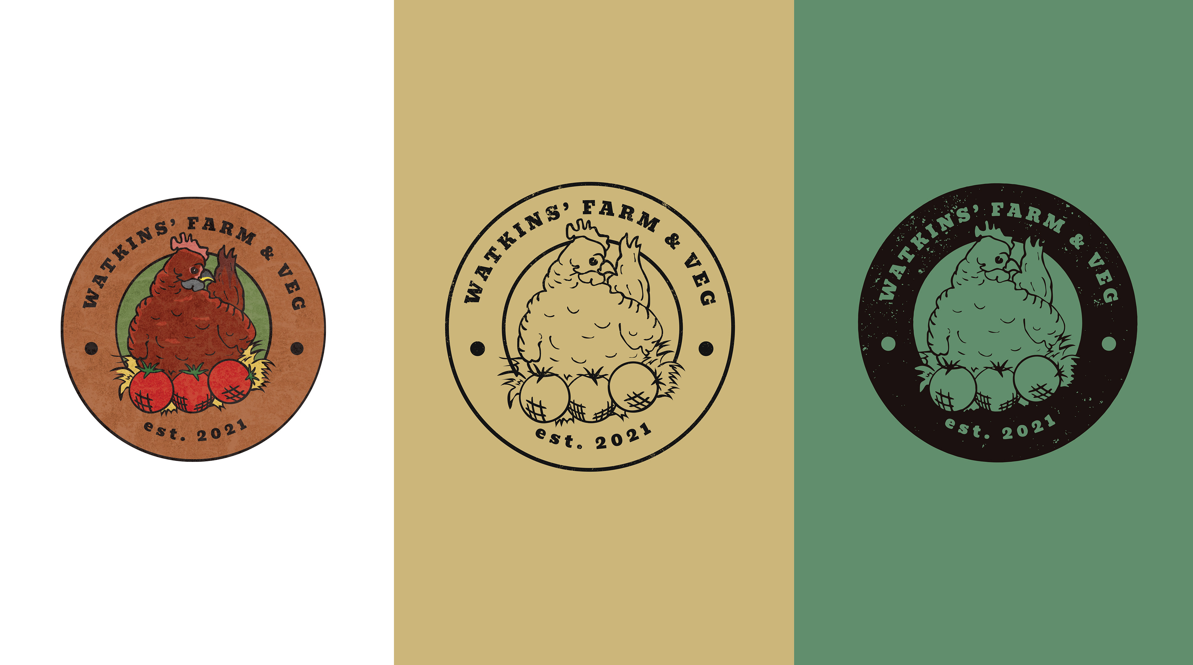The Watkins' Farm and Veg logo comes in three different options for multiple uses and printing cost effective options. The logo promotes their main produce offerings at their market with a chicken sitting on tomatoes instead of eggs.